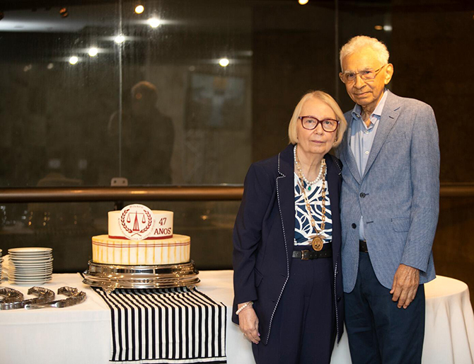 A presidente do IAP, Érika Ferraz, recebeu na confraternização no Chicana, o jurista e professor aposentado da UFPE Francisco Queiroz Cavalcanti.
