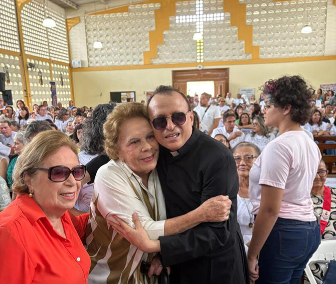 A ex-primeira dama do Recife Geralda Farias e a acadêmica Jô Mazzarolo entre as presenças na posse do Padre Cosmo, na Paróquia da Sagrada Familia, em Igarassu.