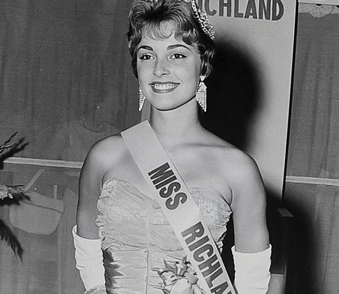 A atriz Sharon Tate (1943/1969) quando foi coroada Miss Richland de 1959, em Washington, durante Atomic Frontier Days festival. No