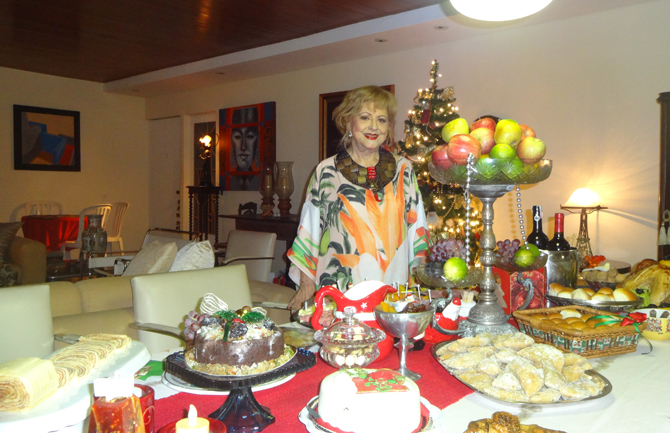 O bufê é o tradicional de Natal, preparado com requinte que só mesmo os grandes chefs sabem fazer e Maria Adélia da Silva arrasou no cardápio que era para a gente comer rezando para Nossa Senhora de Boa Viagem. Sobre a mesa forrada de toalha de linho branco com contraponto vermelho, estavam peru à Califórnia, presunto, torta de frango e bacalhau à Napolitana. E para sobremesas bolo de rolo, pasteis de festa, bolo de frutas e de noiva.