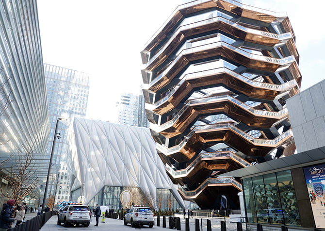 O Hudson Yards Vessel, em Manhattan, Nova York, foi fechado por tempo indeterminado. O conjunto de escadas em espiral de 150 pés, com a estrutura do navio de 15 andares foi projetada pelo designer inglês Thomas Heatherwick, por conta do terceiro suicídio em menos de um ano. Atualmente fora dos limites, os operadores estão consultando especialistas em prevenção de suicido, para discutir o que fazer com o Vessel. Muito antes de sua inauguração, em 15 de março de 2019, as pessoas estavam preocupados com a plataforma, que é uma obra de arte. Uma jornalista de arquitetura, Audrey Wachs, escreveu: “À medida que alguém sobe no Vessel, as grades ficam um pouco acima da altura da cintura até o topo da estrutura, mas quando você constrói alto, as pessoas pulam.”