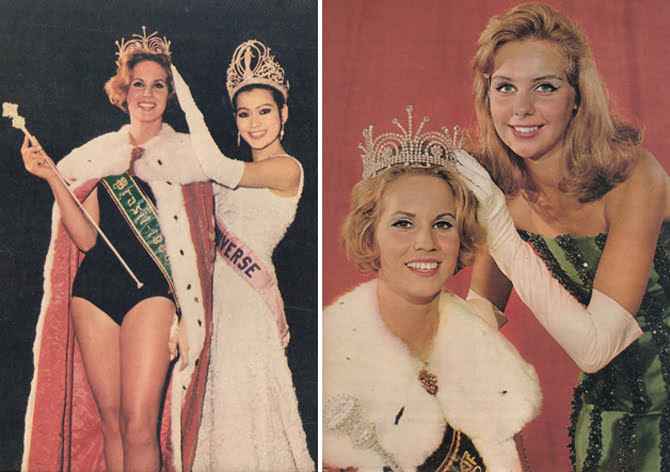Ana Cristina sendo coroada pela Miss U-65, Aspa Hongsakula e Miss B-65 Maria Raquel (Foto: Manchete e O Cruzeiro)