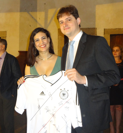 O cônsul Dietmar Bock apresentou o grupo e convidou todos a ficarem de pé a fim de ouvirmos a execução dos hinos da Alemanha, composto por Haydn, terra da banda; o da Comunidade Européia (4ª Sinfonia de Beethoven) e o Hino do Brasil, tocados pela Big Band. Depois o cônsul geral da Alemanha fez sua saudação, em português e em alemão). Lembrou a conquista do titulo de campeão do mundo um momento inesquecível para eles. Depois comandou um leilão de uma camisa da seleção alemã, assinada por todos seus jogadores. O vencedor foi Ricardo Wanderley com um lance R$ 1.200,00, que será destinado para uma ONG que assiste jovens carentes na Mirueira, do jogador Palhinha.