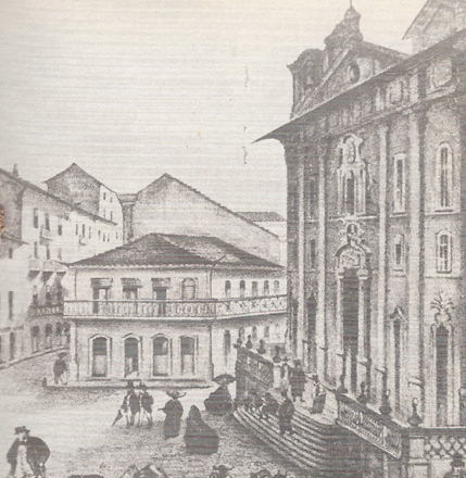 O Internacional é o sobrado de dois andares diante da Igreja do Corpo Santo (Litografia de F. H. Carls)