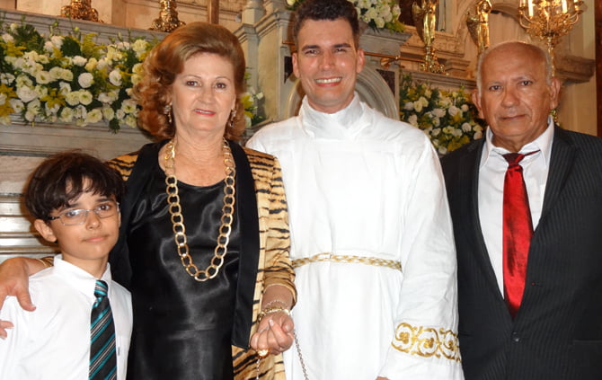 Padre Hewerton ao lado dos pais José Alves e Rosália e do sobrinho João Pedro (Foto: Fernando Machado)