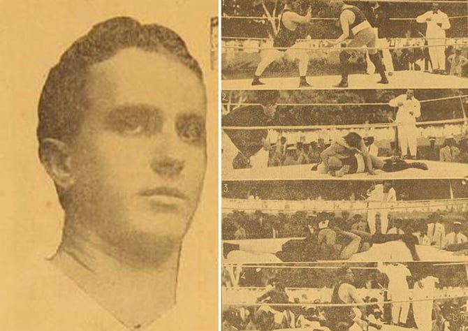 Há 95 anos, no campo do América, José Floriano Peixoto vencia o campeão mundial E. Goldstein (Leão Russo) de boxe.