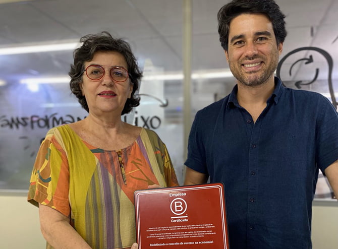 Magna Coeli e Marcos Queiroz, da Refazenda, comemoram a certificação de Empresa B. Segundo Marcos Queiroz, Diretor de Soluções da empresa, a certificação reconhece boas práticas e políticas, e o compromisso em aspirar altos padrões de desempenho social e ambiental, e de transparência e responsabilidade.