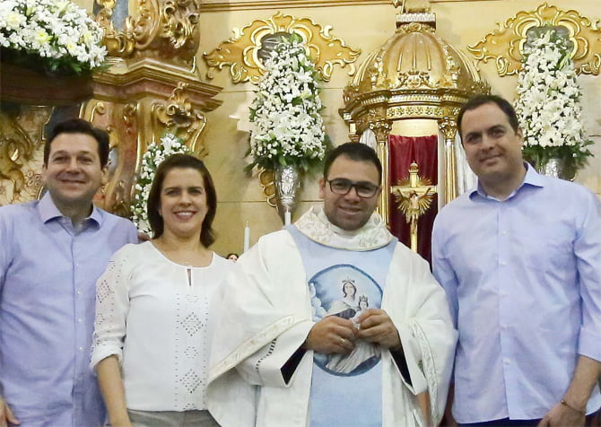 O governador Paulo Camara, o prefeito Geraldo Julio e a primeira dama, Cristina, participaram ontem da missa das 8h, na Basílica do Carmo.