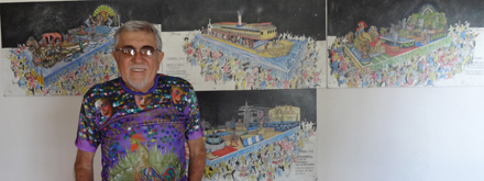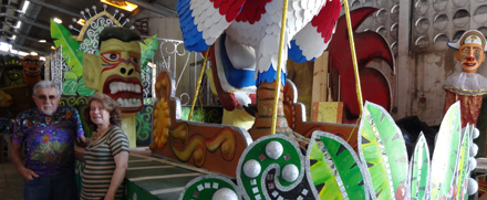Temos também o carro das Carrancas, das Uvas e o do navio-gaiola, tudo remetendo ao Rio São Francisco. Ary Nóbrega criou 90 alegorias de mão e 20 bonecos articulados. Eu tive a alegria de vê-los no galpão nos arredores da Rua da Concórdia, levado por Carmen Towar. Ele é casado com Rejane e pai de seis filhos.
