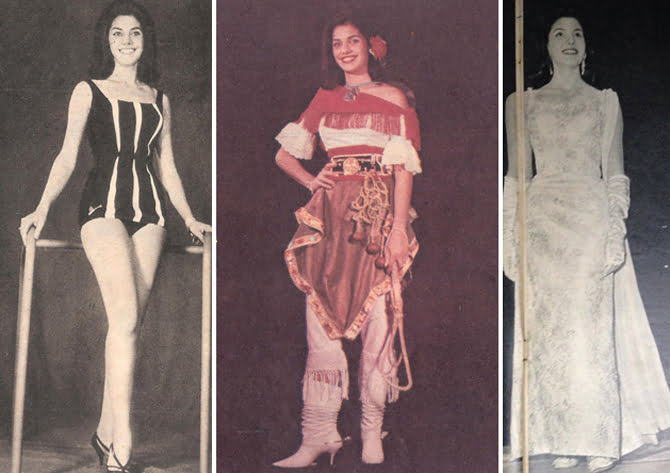 Ieda Vargas de maiô, traje típico e traje de baile (Fotos: O Cruzeiro e Manchete)