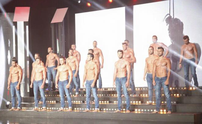 Os candidatos na abertura do desfile sem camisa (Foto: Divulgação)