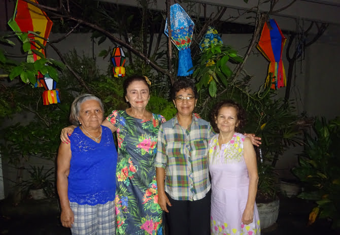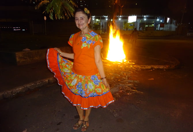 De repente fogos surgiam pelo céu e assim a noite foi passando agora no terraço da residência com uma mesa farta, cujo cardápio era de a gente também comer rezando para Santo Antônio, São João e São Pedro. Foi um encontro petit comité, que é ótimo. Na mesa forrada de chita repousavam bolos de mandioca, macaxeira e pé-de-moleque, pamonha, canjica, milho cozido e assado, queijo de coalho assadinho na hora. Lá para as tantas foi servido um creme à lá Misa. Uma delicia.
