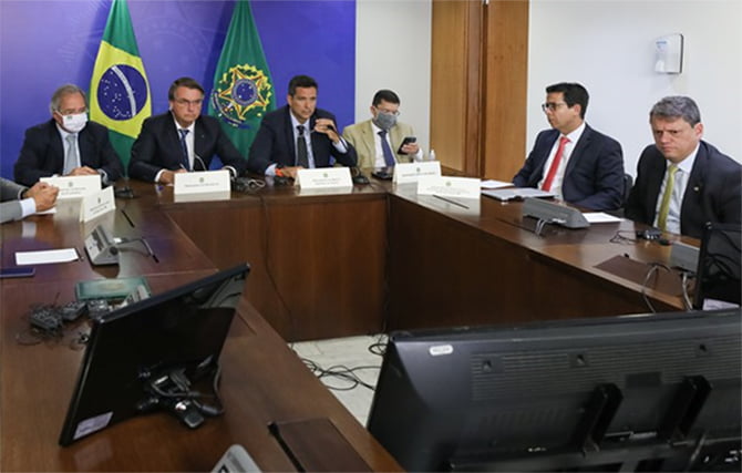 O presidente Bolsonaro e o ministro Paulo Guedes em videoconferência (Foto: Marcos Correa)