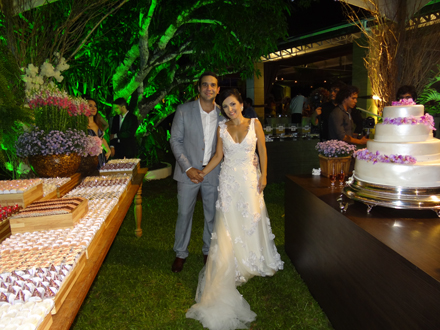 Na tenda onde repousava o bolo de quadro andares de Lucinha Cascão as peças eram rústicas com flores tipo lisianthus e orquídeas. Na mesa de doces além destas flores citadas tínhamos bocas de leão, rosas, ásteres em dégradée de rosa até alcançar o lilás. Também tínhamos um lounge num estilo bem rústico rodeado de flores. Na tenda onde aconteceu a festa e dança, lustres de folhagens caiam do teto e sobre as mesas gaiolas com velas ou castiçais lotado de flores.