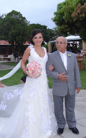 Duas daminhas acompanhadas de dois pajens (eles traziam duas placas com os seguintes dizeres: “Ainda dá tempo de fugir!” e “Foge não, Ela tá linda! Quando a noiva surgiu, caso fosse numa igreja Católica diria convicto, pela nave central, houve um murmúrio, “mas, que noiva deslumbrante”. E a estrela desabou no choro, dando um toque todo especial à solenidade.
