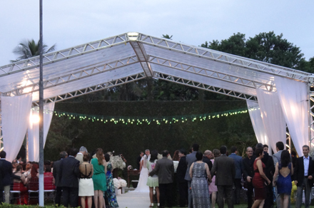 Na pérgula da piscina podia-se admirar bastões do imperador e alpinas. No lado contrário foi montada uma tenda onde aconteceu a cerimônia religiosa presidida pelo bispo da Igreja Episcopal Carismática Alexandre Ximenes, estava com uma decoração cool. No altar nada de símbolos religiosos e atrás dele surgia uma parede coberta de heras. Também tinha alguns arranjos quadrados de rosas e orquídeas.