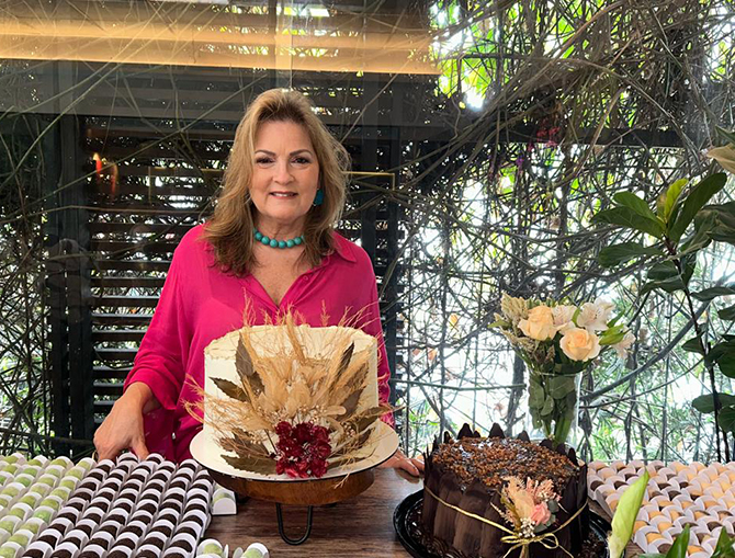 Mônica Rios Rodrigues diante do bolo (Foto: Fernando Machado)