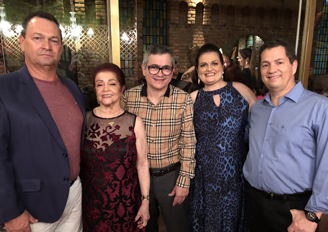 Ontem, à noite, a senhora Jesonita Elihimas, acompanhada dos filhos Ivanildo, Valmir, Valdir e Valéria, reuniu um grupo de amigos para jantar no Restaurante Famiglia Giuliano, para comemorar seus 80 anos. A decoração muito bonita foi grifada por Raffaela Million. O bolo de quatro andares foi assinado pela filha da aniversariante Valéria Elihimas. Um coral de 40 vozes cantou os tradiconais parabéns para você.