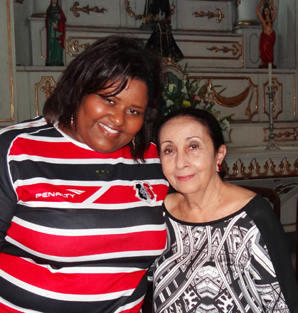 A secretária do Santinha Danielle Andrade e a estilista Ademilde Miranda na Missa do Santa Cruz (Foto: Fernando Machado)