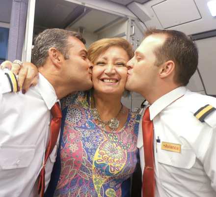 Os comissários de bordo Cesar e Sérgio da Avianca beijam Josenilda Fernanda Airola ex Varig (Foto: Cortesia)