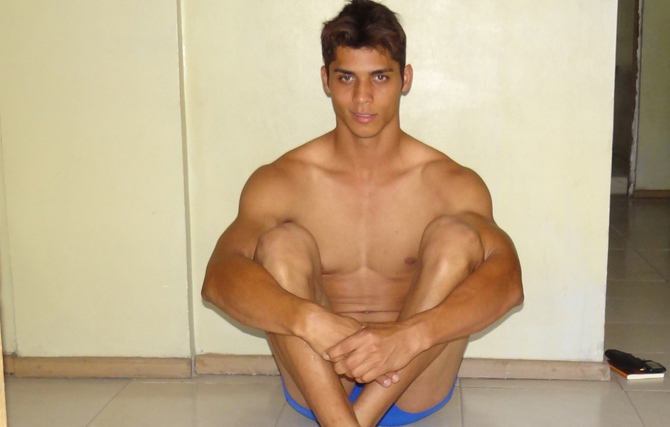 Mister Custódia, Gilliard Moraes, ficou num canto descansando antes de subir na passarela do Mister Pernambuco (Foto: Fernando Machado)