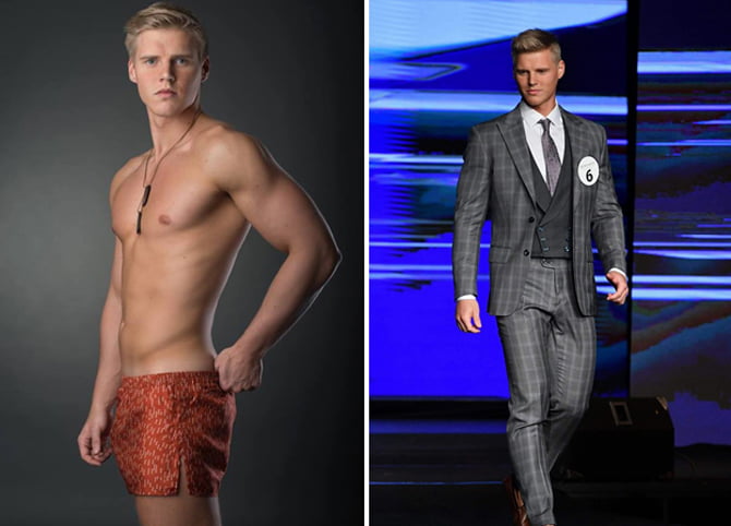 O modelo checo Pavel Kugler em traje de banho e de terno (Fotos: Divulgação)