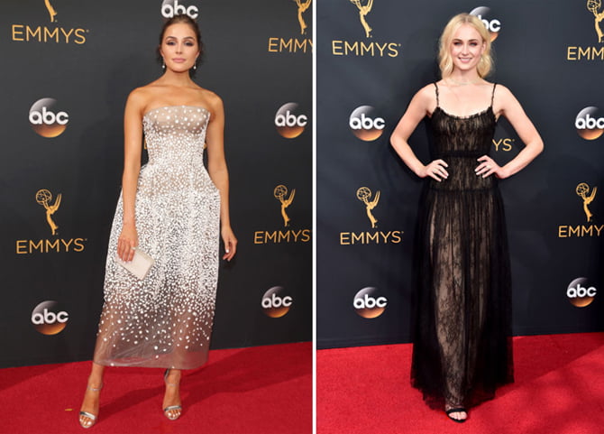 Olivia Culpo by Zac Posen e Sophie Turner by Valentino no tapete vermelho do Emmy (Fotos: Getty e AP)