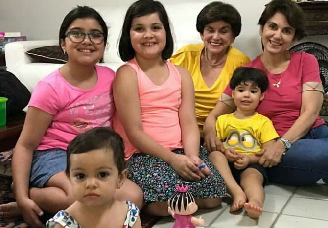 Tinane Almeida ao lada filha Lelê, e dos bisnetos Guilherme Sofia, Gabriela e Sabrina (Foto: Face)