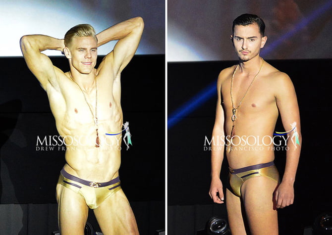 Leatrim Gjugya da Alemanha e Zaine Pringle da Austrália desfilando no Manhunt International (Fotos: Concurso)
