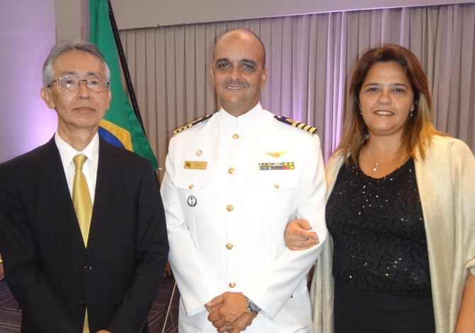 Cônsul geral do Japão Jiro Maruhashi, o comandante da Capitania dos Portos Mauricio Bravo e sua esposa Juliana festa nacional do Japão (Foto: Fernando Machado)