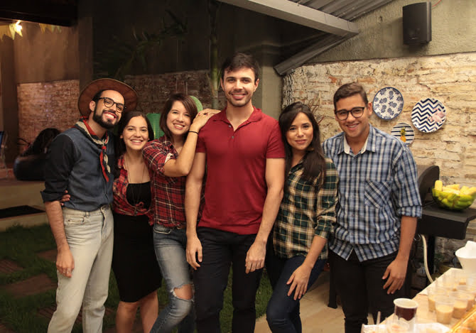 Os jornalistas Mateus Rodrigues, Clara Amorim, Carol Dias, Milton Couto, Natalia Wanderley e Matheus Almeida, da 4com, em ritmo de junino (Foto: Vinícius Ramos)