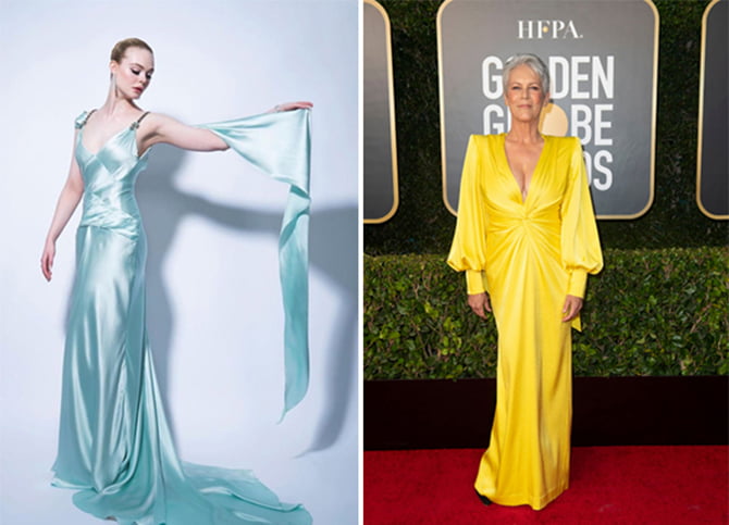 As atrizes Elle Fanning by Gucci e Jamie Lee Curtis by Alex Perry no Globo de Ouro (Fotos: E!)