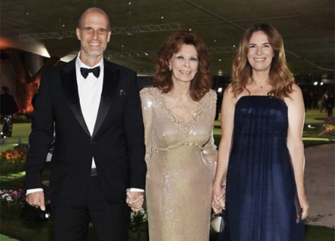 Edoardo Ponti, sua mãe Sophia Loren e Roberta Armani na recepção de Giorgio Armani, na Itália (Foto: Divulgação)