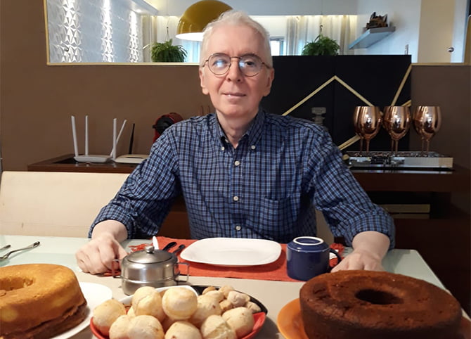 O arquiteto Hélio Silvestre no café da manhã em sua casa (Foto: Face)