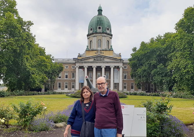 O jornalista Felix Baptista e sua esposa Fernanda diante do Museu de Guerra, em Londres, na Grã-Bretanha (Foto: Face)