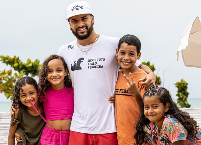 Surfista olímpico Ítalo Ferreira ao lado das crianças que assiste com ONG, em Baia Formosa (Foto: Instagram)