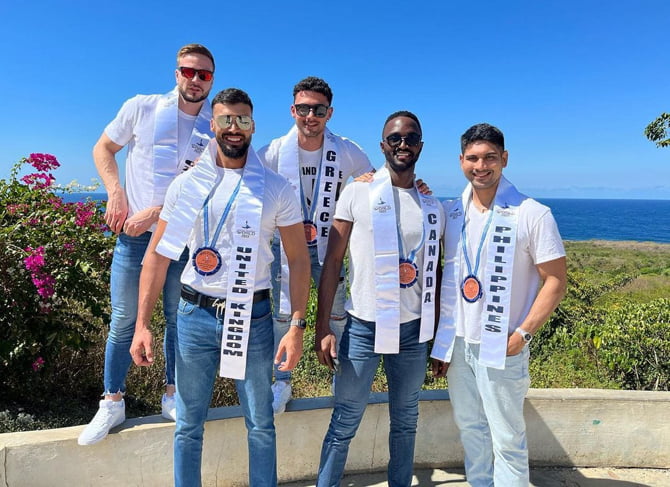 Republica Tcheca Philip Stomenov, Grécia Manos Panarketakis, Inglaterra Robert Dawe, Canadá Celin Miayoukou e Filipinas Mike Francisco que disputarão, sábado, o Mister Turismo do Mundo de 2023 (Foto: Concurso)