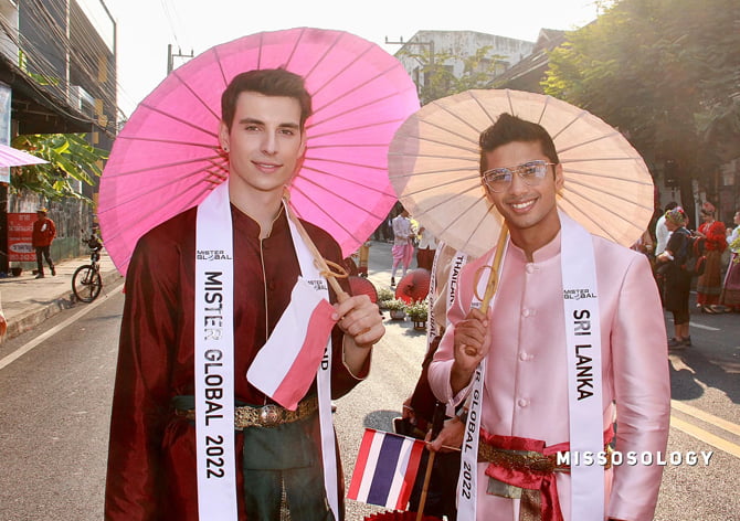 Daniel Dejneżenko da Polônia e Hans Nathan Koch do Sri Lanka n desfile de trajes típicos da Tailândia (Foto: Concurso)