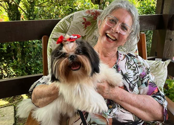 A cerimonialista Rose Paes Barreto com cachorro de estimação na sua casa de campo em Aldeia (Foto: Face)