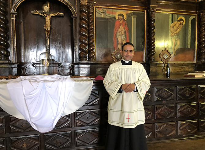 O diácono ainda com a dalmática Davi Melo antes de vestir a casula (Foto: Fernando Machado)
