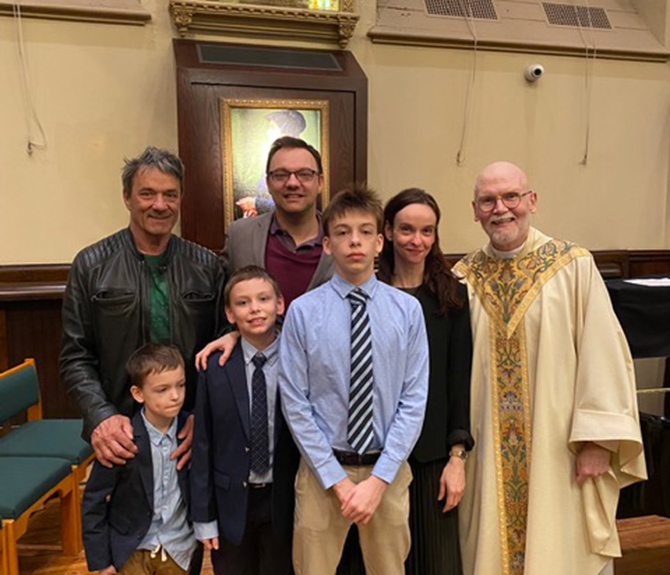Na Primeira Comunhão de Louis, na Igreja de Santa Mônica, em NYC, o avô paterno Norbert, os pais Julien e Marcela Vanegue, padre Baker, Clovis e Adrien (Foto: Acervo da Família)