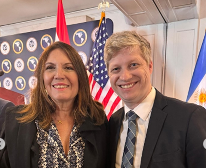 Bia Kicis e Marcel van Hatten na posse de Donald Trump (Foto: Face)