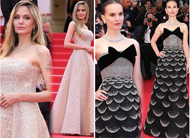 Angelina Jolie by Brunello Cucinelli e Natalie Portman by Christian Dior no tapete vermelho de Cannes (Fotos: Divulgação)