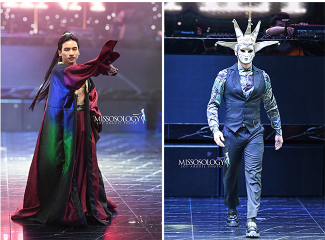 Os trajes típicos de Jaden Sobere Yu da China e de Alessandro Caputo da Itália, que sábado disputarão o titulo de Man of the World (Fotos: Missosology)