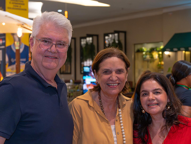Carlos André Gama, sócio do Armazém Guimarães, Lúcia Pontes, diretora do Instituto JCPM, e Valéria Sabrá, gestora local do Armazém Guimarães, na inauguração do Armazém Guimarães, no Riomar (Foto: Eduardo Tumajan)