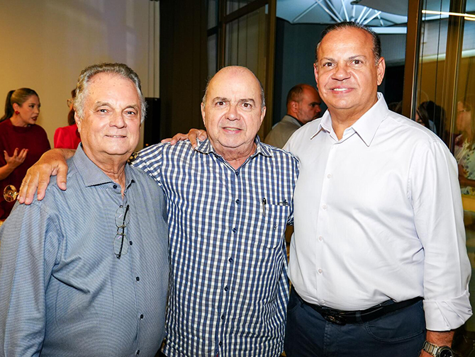 O presidente do Fecomercio Bernardo Peixoto aniversariando ao lado de Carlos Carvalho e Nelson Bezerra (Foto: Maker Mídia)
