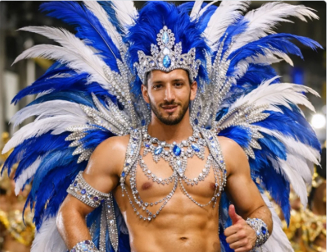 O modcelo Magno Cruz mostrando seu talento no desfile da Beija Flor (Foto: Face)