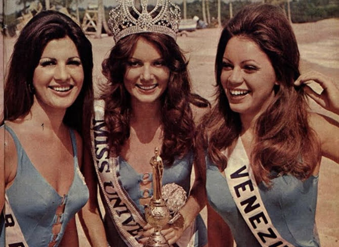 Miss Brasil Rejane Vieira Costa 2º lugar, Kerry Wells Miss Universo de 1972 e Miss Venezuela Maria Antonieta Campoli 3º lugar (Foto: Manchete)