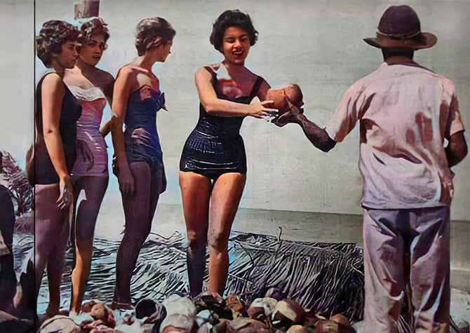 As misses Guaraci Silva, Iara Portela, Louise Brendell e Sônia Maria Campos na Praia de Boa Viagem em 1958 (Foto: Pernambuco Arcaico)