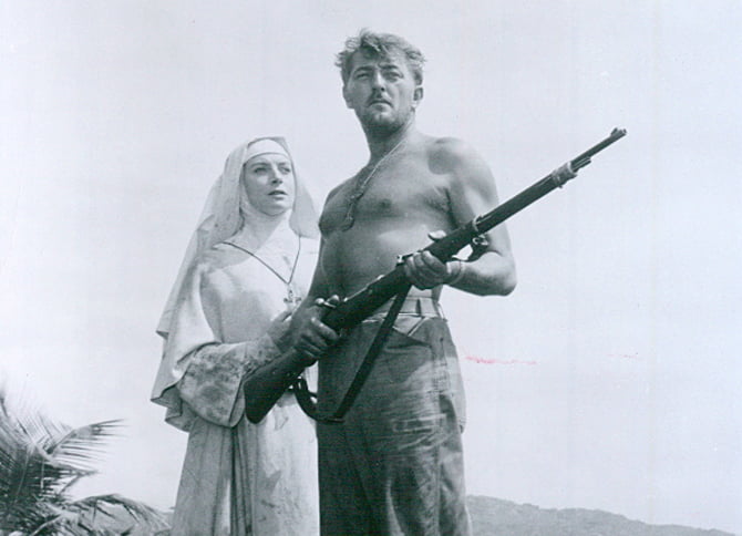 Robert Mitchum e Deborah Kerr nos bastidores do filme Heaven Knows Mr. Allison, 1957 (Foto: Divulgação)